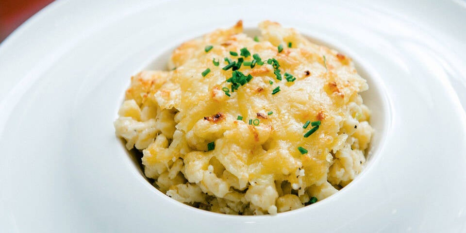 - Zwiebel klein würfeln, in Butter anschwitzen, hier gleich etwas Pfeffer hinzufügen, am besten aus der Pfeffermühle. Nun alle Spätzle in die Pfanne, die Hälfte des Käses dazu. Gut umrühren und gegebenenfalls mit Salz und Pfeffer nachwürzen. Alles gut vermengen. Nun den restlichen Käse gleichmäßig auf der Oberfläche verteilen. Pfanne auf das oberste Blech des Backrohres, dort bei cm 190 °C so lange brutzeln lassen, bis der Käse schön knusprig ist (ca. 20 Minuten).