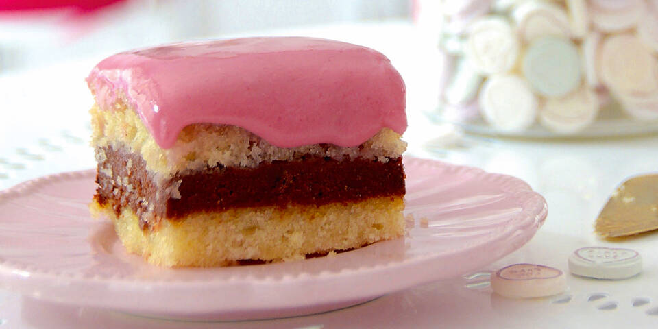 - Die Masse auf den Marmelade-Teigboden aufstreichen und den zweiten Boden darauflegen. In 16 Würfel schneiden und kalt stellen. Die Zutaten für die rosa Glasur verrühren und die Punschkrapfen damit glasieren.