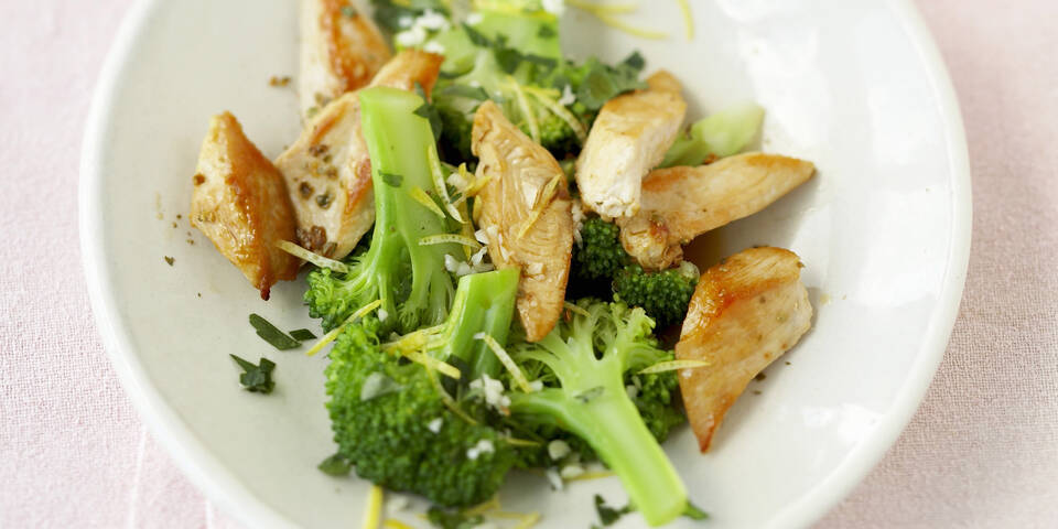 - Die Pute in heißem Öl 2–3 Minuten goldbraun braten und mit Salz und Pfeffer würzen. Mit dem Zitronensaft und nach Bedarf ein wenig Wasser ablöschen und den Brokkoli sowie den Knoblauch und die Zitronenschale unterschwenken. Kurz ziehen lassen, die Petersilie zufügen, abschmecken und servieren.