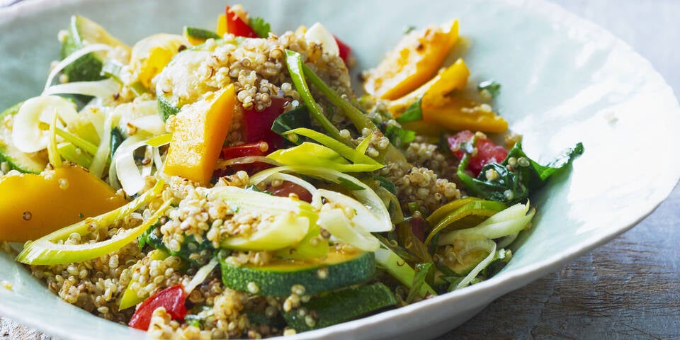 - Den Quinoa in einem Sieb gründlich waschen, abtropfen lassen. Das Öl in einen heißen Topf geben. Den Quinoa mit dem Knoblauch hineingeben und unter Rühren anbraten. Mit Koriander, Kreuzkümmel und Nelken bestreuen, untermischen und kurz mitbraten. Dann den Fond angießen, das Gemüse und die Rosinen untermischen und bei kleinster Hitze unter gelegentlichem Rühren ca. 20 Minuten ausquellen lassen.