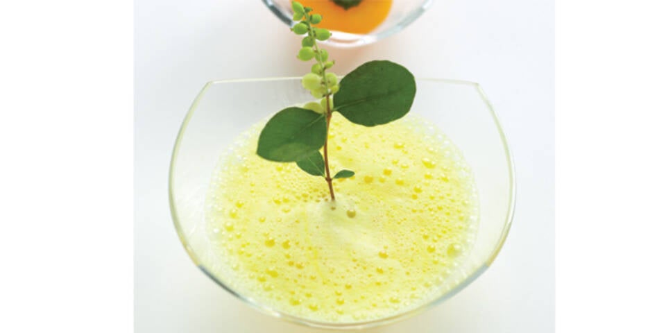Suppe mit einem Pürierstab schaumig aufmixen und mit Kräutern dekoriert servieren.
