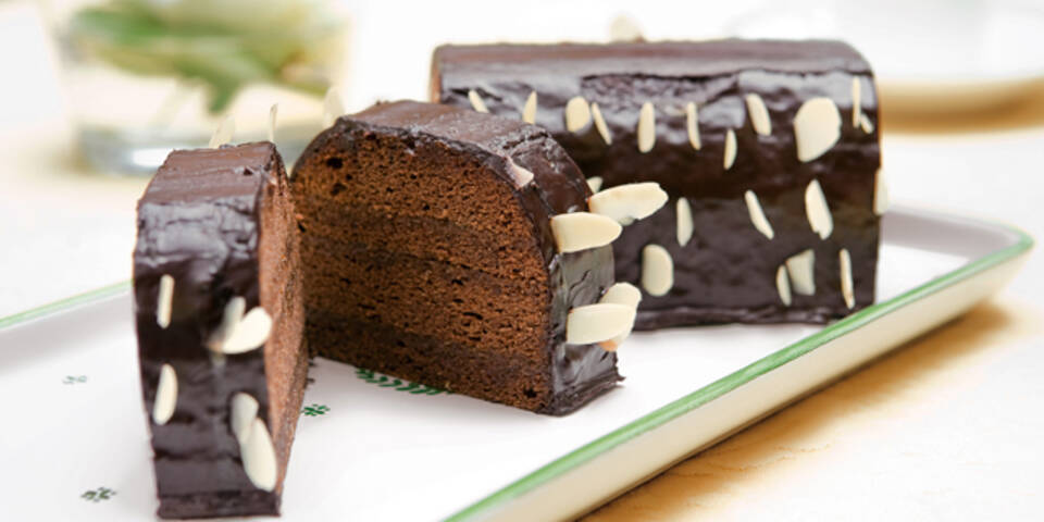 Rehrücken auf einen Rost stürzen, auskühlen lassen und mit Kuvertüre und Mandelsplittern dekorieren.