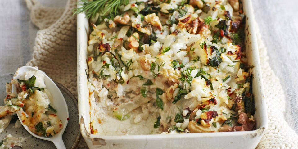 - Öl in einer Pfanne erhitzen und Zwiebel und Knoblauch glasig schwitzen. Mangoldstiele zugeben und ca. 2 Minuten mitdünsten. Etwas abkühlen lassen und mit den Mangoldblättern, Nüssen, Käse und Reis mischen. Die Eier mit Obers sowie Crème fraîche verquirlen und mit Dill, Salz und Pfeffer würzen. Die Reismischung in die Auflaufform geben und mit dem Eierobers übergießen. Im vorgeheizten Ofen ca. 35 Minuten backen.