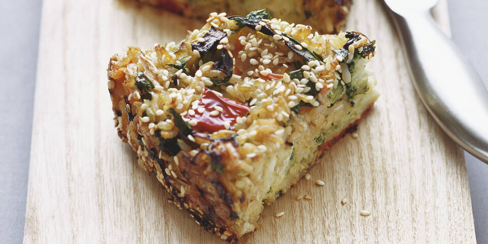 - Den Reis und das Gemüse untermengen und alles in eine gefettete Springform füllen. Den Kuchen mit dem Sesam bestreuen und im vorgeheizten Ofen bei 180 °C ca. 45 Minuten goldbraun backen. In Stücke geschnitten servieren.
