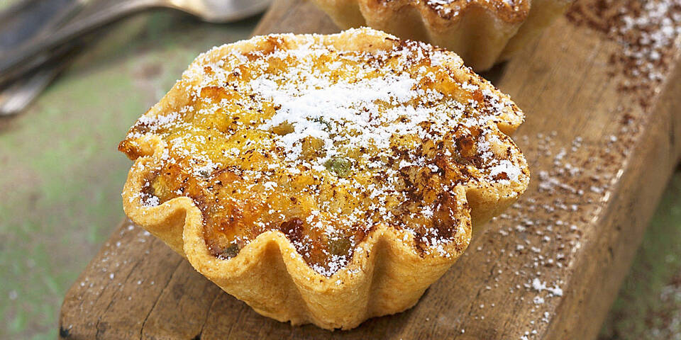 - Den Backofen auf 160 °C Umluft vorheizen. Die geriffelten Tortelett-Förmchen oder Muffinblechvertiefungen ausbuttern und mit Mehl bestauben. Den Teig ausrollen und in Formgröße ausstechen. Die Formen damit auskleiden und die Reismasse einfüllen. Im Ofen ca. 30 Minuten goldbraun backen. Etwas abkühlen lassen, aus den Förmchen lösen, auskühlen lassen und mit Staubzucker und Kakao bestaubt servieren.