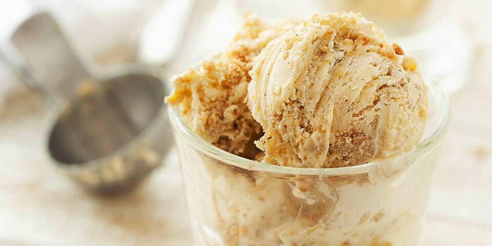 Tipp: Wer keine Eismaschine besitzt, kann die Eiscreme auch in einen flachen Behälter füllen, die Streusel darauf verteilen und im Tiefkühler ca. 5 Stunden abgedeckt gefrieren lassen. Dabei am Anfang alle ca. 20 Minuten kräftig durchrühren, damit sich keine zu großen Kristalle bilden.