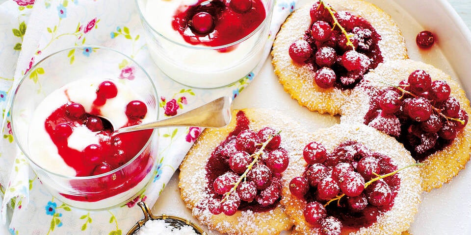 - Auf jeden Keks einen Esslöffel von den Ribiseln geben, mit übrigen Rispen garnieren und mit Staubzucker bestaubt servieren.