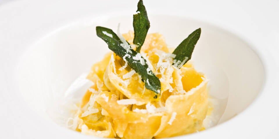 Die Butter in einer Pfanne schmelzen, die Tortelloni darin schwenken. Mit Salz, Pfeffer, Olivenöl, dem Salbei und etwas Parmesan vollenden.