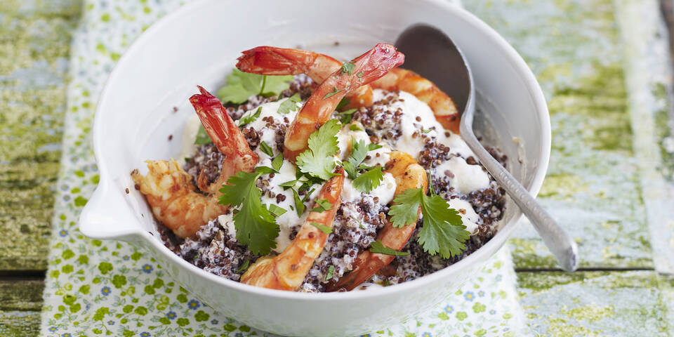 - Die Garnelen waschen, trocken tupfen und mit einer angedrückten Knoblauchzehe in heißem Öl rundherum 2–3 Minuten braten. Die Ricottacreme mit der Chilischote locker unter den Quinoa mischen, abschmecken, auf Schälchen verteilen, die Garnelen darauf anrichten und mit Petersilie garniert servieren.