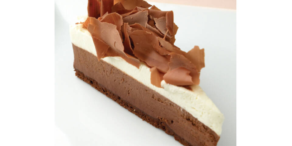 Dunkles Schokolademousse auf den Tortenboden streichen. Form mit Frischhaltefolie abdecken und am besten über Nacht in den Kühlschrank stellen. Weißes Schokoladeobers wie Schlagobers fest aufschlagen und gleichmäßig auf das dunkle Mousse streichen.