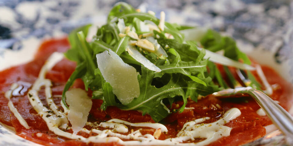 - Rucola waschen und trocknen. Parmesan und Rucola auf Carpaccio verteilen.