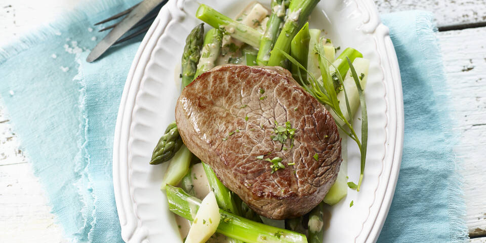 - Den Ofen auf 100° C Unter- und Oberhitze vorheizen. Die Steaks abbrausen und trocken tupfen. In einer heißen Pfanne im Öl auf jeder Seite zwei Minuten braun anbraten. Aus der Pfanne nehmen, salzen, pfeffern und auf einen Rost legen. In den Ofen schieben. Je nach Fleischdicke und gewünschtem Gargrad 15 Minuten ziehen lassen.