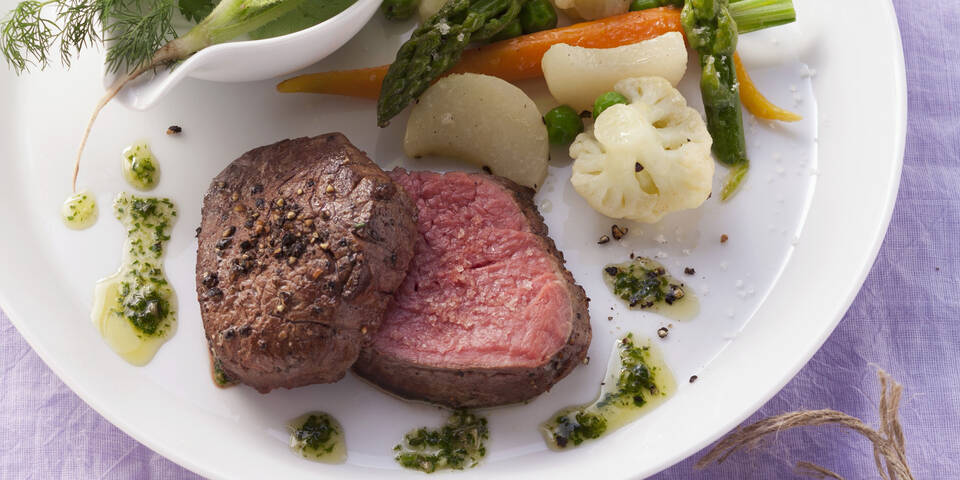 - Das Fleisch waschen, trocken tupfen, salzen und pfeffern und in einer heißen Pfanne mit Öl von allen Seiten scharf anbraten. Im Ofen bei 140 °C ca. acht Minuten ziehen lassen. In einer Pfanne die Butter zerlassen, das Gemüse hineingeben, kurz durchschwenken, salzen, pfeffern und mit dem Fleisch auf vorgewärmte Teller anrichten. Mit der Kräutersauce beträufelt und mit den restlichen Kräutern garniert servieren.