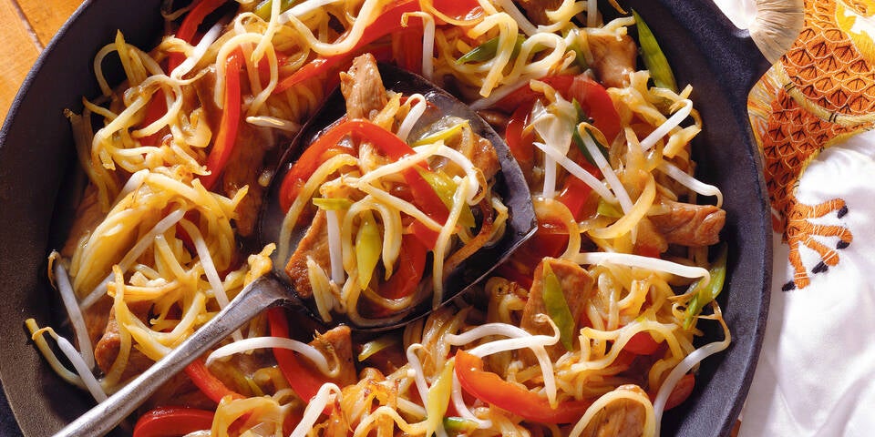 - Die frittierten Rindfleischstücke sowie Paprikawürfel und Sojasprossen zufügen, kurz durchschwenken und sofort servieren. Die Rindfleischstücke sollten schön knusprig sein.