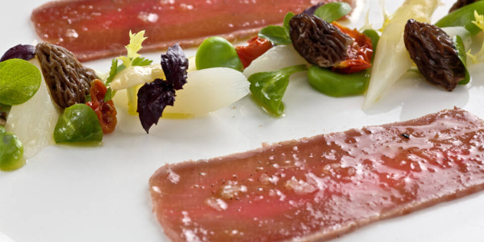 Die Morcheln in einer Pfanne anbraten, Schlaotten zugeben und mit Sherry ablöschen. Kurz einkochen lassen, Petersilie beigeben und mit dem gebeiztem Rinderfilet und dem marinierten Spargel servieren.