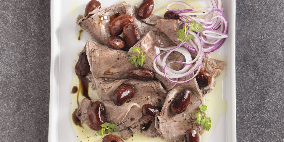 - Essig, kalte Suppe (Brühe oder Wasser), Öl und reichlich Salz zu einer Marinade verrühren. Marinade über Rindfleisch, Käferbohnen und Zwiebeln gießen, vorsichtig vermischen.