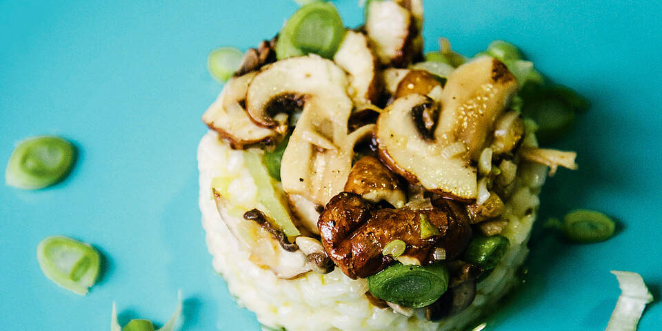 - Das Grün der Frühlingszwiebeln mit einer Küchenschere in Ringe schneiden, beiseite stellen. Shiitake-Pilze mit feuchtem Küchenpapier putzen und in Scheiben schneiden. Das Weiß der Zwiebeln fein hacken und in einer Pfanne mit Butter glasig anschwitzen, anschließend die Pilze hinzugeben – ca. 5 Minuten braten, salzen und pfeffern. Zum Schluss mit den Frühlingszwiebelringen vermischen und auf das portionierte Risotto verteilen und servieren.