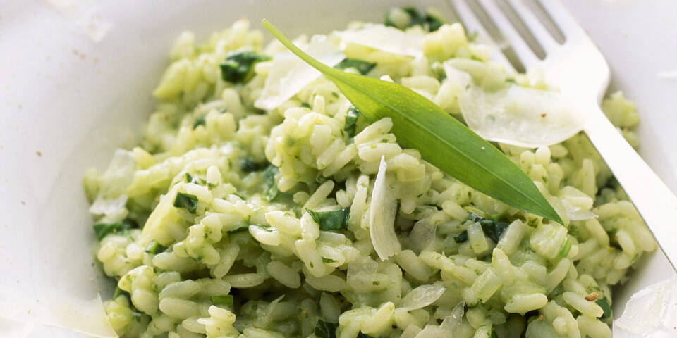- Den Bärlauch abbrausen, putzen und kurz in Salzwasser blanchieren. Abschrecken, gut abtropfen lassen und fein hacken. Die Zwiebel schälen und fein würfeln. In heißem Öl farblos anschwitzen. Den Reis untermengen, kurz mitschwitzen und mit dem Wein ablöschen. Die Flüssigkeit vom Reis aufnehmen lassen und nach und nach unter Rühren den Fond angießen und immer wieder vom Reis aufnehmen lassen. Auf diese Weise etwa 20 Minuten garen, bis das Risotto cremig ist, aber der Reis noch leichten Biss hat.