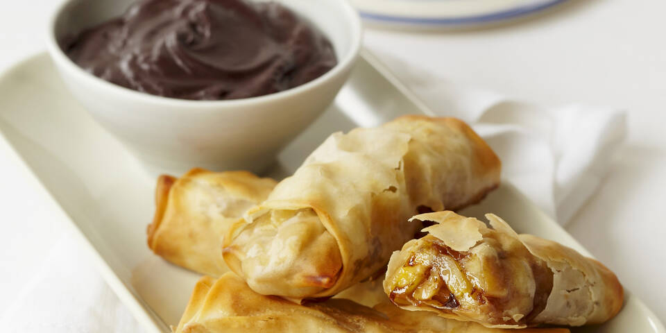 - Die Filoteigblätter ausbreiten und in 12 cm breite Streifen schneiden. Die Teigstreifen mit zerlassener Butter bestreichen und mit dem Zucker bestreuen. Etwas von den Bananen oberhalb der Teigstreifen verteilen, die langen, gegenüberliegenden Seiten ca. 1,5 cm zur Mitte einschlagen und die Teigstreifen von der kurzen Seite her einrollen.