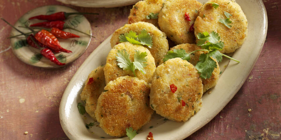 - Aus der Masse kleine Laibchen formen und in Mehl wenden. In heißem Pflanzenöl in einer großen Pfanne auf jeder Seite 3–4 Minuten goldbraun braten. Auf Küchenpapier abtropfen lassen.