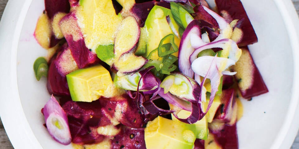 Senf, Essig und Olivenöl in einer kleinen Schüssel verrühren und mit Salz und Pfeffer würzen. Die Rote Rübe in das Dressing geben und vorsichtig vermischen. Die Rote Rübe auf eine Platte oder auf Teller geben und Avocadostücke und Frühlingszwiebeln darauf verteilen.