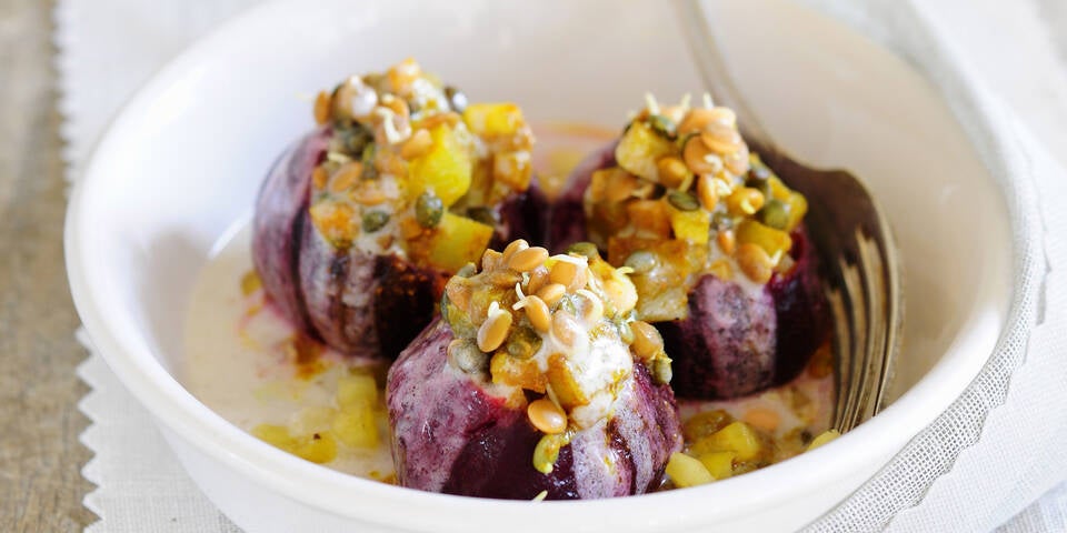 - Für die Sauce Äpfel schälen, vierteln, Kernhaus entfernen und klein würfeln. Erdnüsse hacken und mit Äpfeln im restlichen Öl kurz anschwitzen. Kokosmilch angießen und aufkochen lassen. Mit Salz und Pfeffer abschmecken. Rote Rüben mit Linsengemüse füllen, Soße darüber gießen.