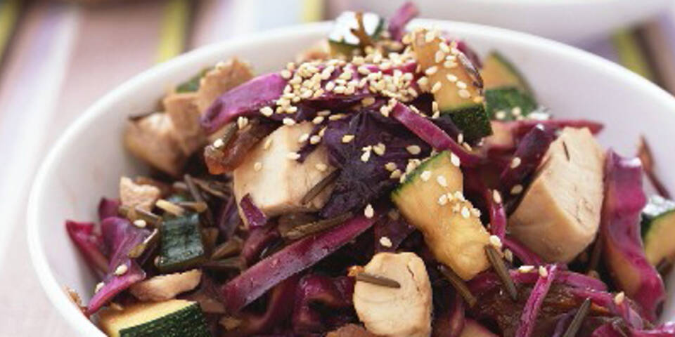 - Die Zucchini waschen und in mundgerechte Stücke schneiden. Diese in 2 EL Öl 3–5 Minuten bissfest anbraten, salzen und unter das Rotkraut mengen. Ebenso den abgetropften Reis. Die Hühnerbrüste waschen, trocken tupfen und in Würfel schneiden