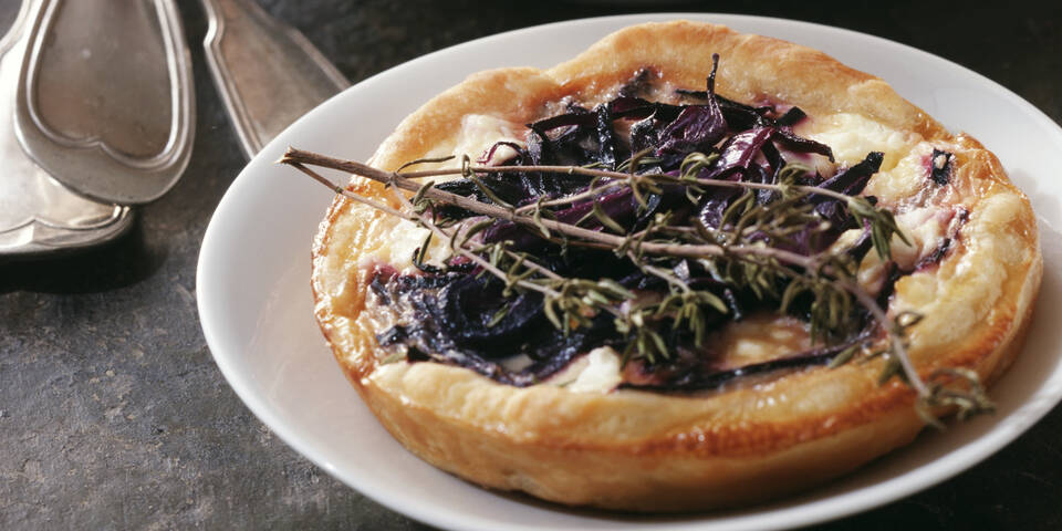 Den Teig in 6 Stücke teilen, in Formgröße ausrollen und die Förmchen mit dem Teig auskleiden. Die Käsemasse darauf verteilen, das abgetropfte Gemüse darauf geben und mit dem Thymian belegen. Im vorgeheizten Backofen ca. 35 Minuten goldbraun backen.