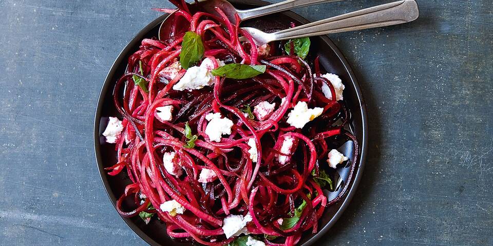 - Das Dressing mit den Rübenstreifen mischen, den Ziegenkäse darauf verteilen und die Basilikumblätter darüberstreuen.