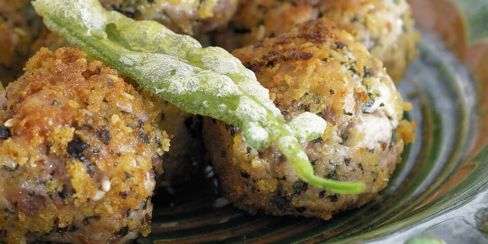 - Die Semmel in ein wenig lauwarmem Wasser einweichen. Die Hälfte der Salbeiblätter waschen, trocken tupfen und sehr fein hacken. Semmel ausdrücken und mit 1 Ei, den Sesamsamen und dem gehackten Salbei unter das Faschierte mengen. Mit Salz und Pfeffer würzen und aus der Masse etwa walnussgroße Bällchen formen. Die Bällchen zunächst in verquirltem Ei, dann in einer Mischung aus Mehl und Semmelbröseln wenden.