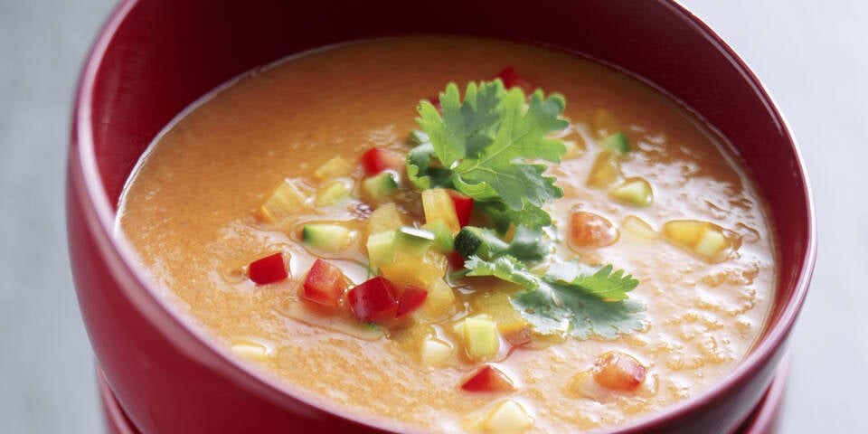 - Mit Zucker, Zitronensaft und Salz abschmecken. Die fertige Creme in Schüsseln füllen und mit den restlichen kleinen Gemüsewürfeln bestreut und mit Petersilienblättchen garniert heiß servieren.