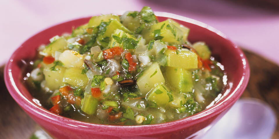 - Öl in einem Topf erhitzen. Schalotte goldbraun anschwitzen, Knoblauch und Chili zugeben und kurz mit andünsten. Gurke untermengen, Apfel-, Zitronensaft, Essig und Honig zugeben und zugedeckt ca. 4–5 Min. schmoren lassen. Die Speisestärke mit wenig Wasser glatt rühren. Unter die Gurken mischen, einmal kräftig aufkochen lassen. Petersilie zugeben und mit Salz und Tabasco abschmecken, lauwarm oder kalt servieren.