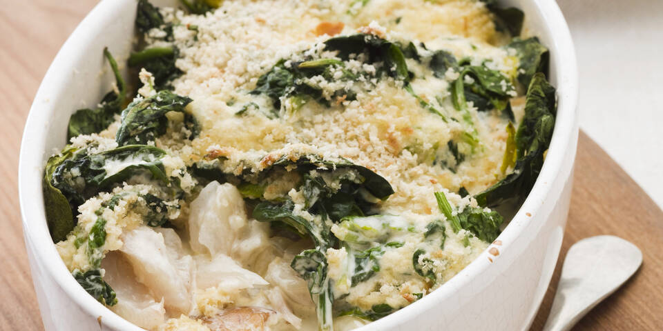 - Den Schellfisch waschen, trocken tupfen, in 2 cm große Würfel schneiden und in eine gefettete Auflaufform geben. Den Spinat darauf verteilen.