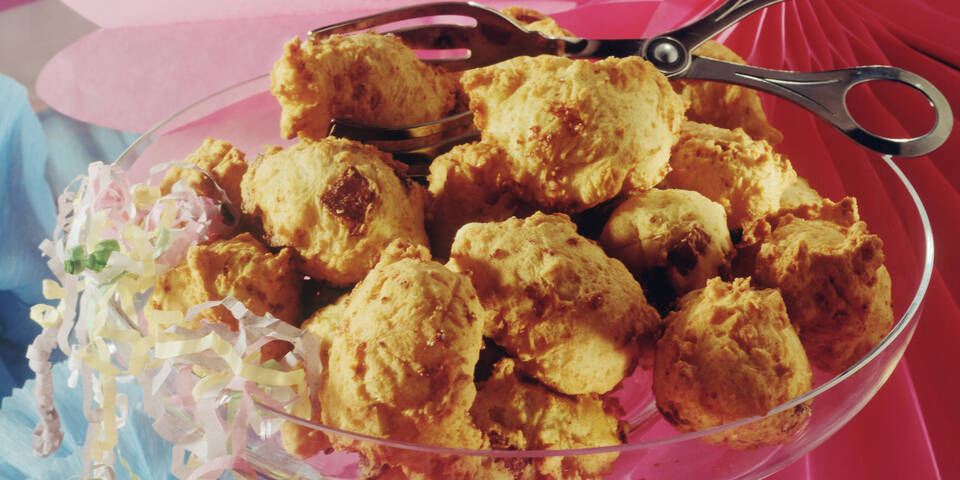- Den Teig in eine Rührschüssel geben. Das Salz mit Backpulver mischen mit den Knethaken des Handrührgerätes einarbeiten. Die Eier nach und nach unterrühren und alles zu einem glatten, glänzenden Teig verarbeiten. Den Schinken klein würfeln und mit dem Käse unter den Teig kneten.