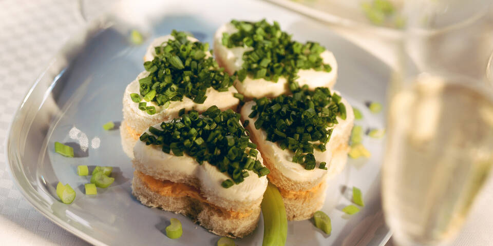 - Die Sandwichherzen auf vier Teller zu Kleeblättern zusammensetzen und je ein Stück Frühlingszwiebelgrün ansetzen.