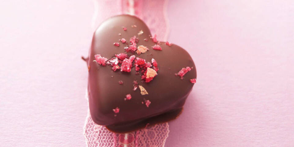 Die Schokolade grob hacken und über einem heißen, nicht kochenden Wasserbad schmelzen. Vom Herd ziehen und etwas abkühlen lassen. Die Marzipanrohmasse mit dem Staubzucker und dem Orangenlikör verkneten. Auf wenig Staubzucker ca. 1 cm dick ausrollen und 20–25 Herzen ausstechen. Diese mithilfe einer Pralinengabel in die Schokolade tauchen, abtropfen lassen und nach Belieben mit gehackten Pistazien, getrockneten Lavendelblüten und Trockenbeeren bestreuen. Auf einem Kuchengitter trocknen lassen und servieren.