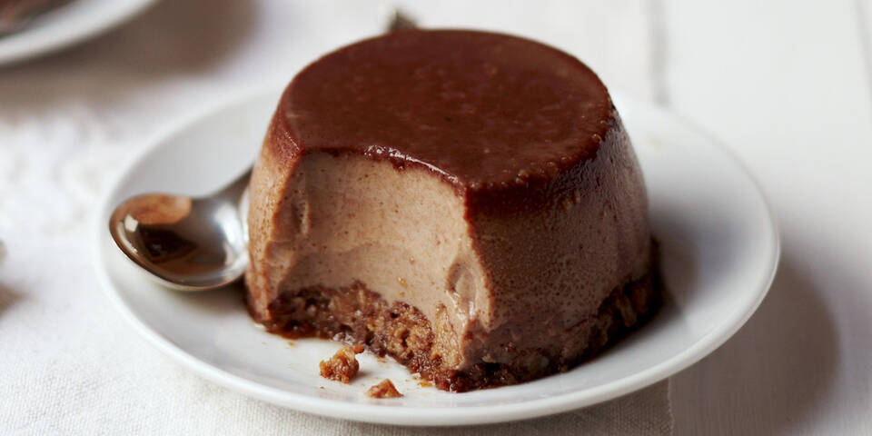 - Die Amarettinis zerbröckeln und mit Amaretto beträufeln (sie sollen feucht sein). Die Masse in die Förmchen geben und auf den Mini-Puddings verteilen, fest andrücken. Die Förmchen für mindestens zwei Stunden zurück in den Kühlschrank stellen. Zum Servieren die Förmchen kurz in heißes Wasser halten, den oberen Rand mit einem Messer lösen und die Puddings auf Teller stürzen.