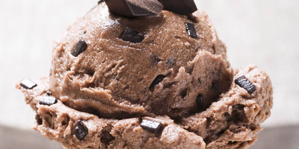 - Die restliche Schokolade fein hacken. Das restliche Obers leicht aufschlagen und mit den Schokosplittern unter die Schokoladenmilch rühren. Das Ganze in der laufenden Eismaschine fertigstellen. Nach Belieben in Eistüten füllen und mit Schoko garnieren.