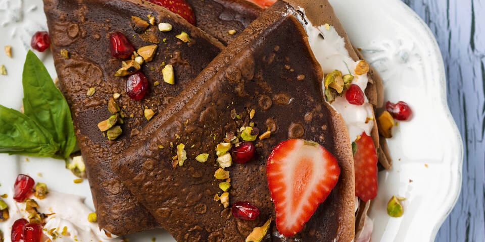 - Eier, Milch, Mehl, Kakao und Zucker zu einem glatten Teig verrühren und ca. 20 Minuten ruhen lassen. Die Erdbeeren waschen, das Grün entfernen und halbieren. Die Granatapfelkerne auslösen. Die Pistazien grob hacken. Das Obers mit dem Vanillezucker steif schlagen.
