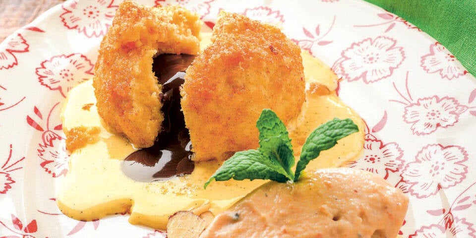 - Für die Topfenknödel Vanillestange längs aufschneiden, Mark herauskratzen, Stange beiseite legen. Topfen, Vanillemark, 35 g Butter, Zucker, Zitronenschale, 60 g Semmelbrösel mit Ei & Eidotter glatt verrühren, Teig etwa 15 Min. quellen lassen. Schokolade in vier Stücke schneiden. Aus dem Teig mit angefeuchteten Händen vier Knödel formen, je ein Stück Schokolade in die Mitte drücken, Teig verschließen. Wasser in großem Topf mit Zimt, ausgekratzten Vanillestangen und Salz aufkochen. Knödel etwa 10 Min. garziehen lassen. Übrige Semmelbrösel in etwas Butter anrösten, Knödel darin wenden.