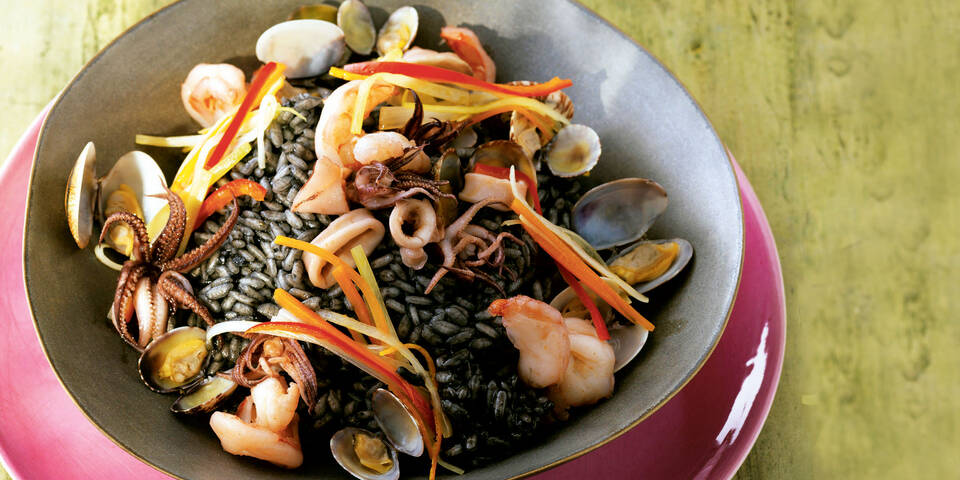 - 0,2 l Fischfond und 0,2 l Weißwein aufkochen lassen und vom Feuer nehmen. Oktopusse, Shrimps und Muscheln zugeben, zugedeckt bei zehn Min. gar ziehen lassen. Herausnehmen und auf dem Risotto anrichten. Gemüsestreifen kurz in den Fisch-Weißwein-Fond geben, abtropfen lassen und ebenfalls auf das Risotto geben.