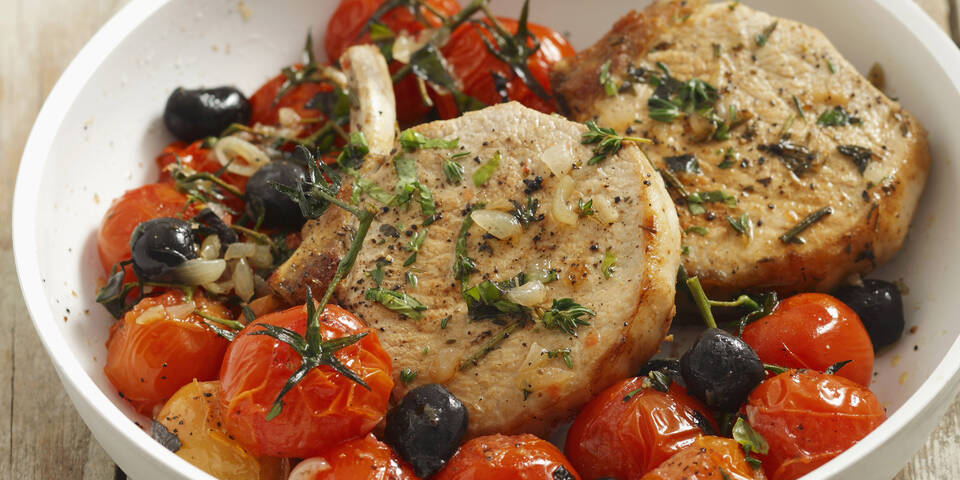 - Den Ofen auf 170 °C Umluft vorheizen. Das Fleisch waschen, trocken tupfen, salzen und pfeffern. Die Paradeiser waschen und die Oliven abtropfen lassen.