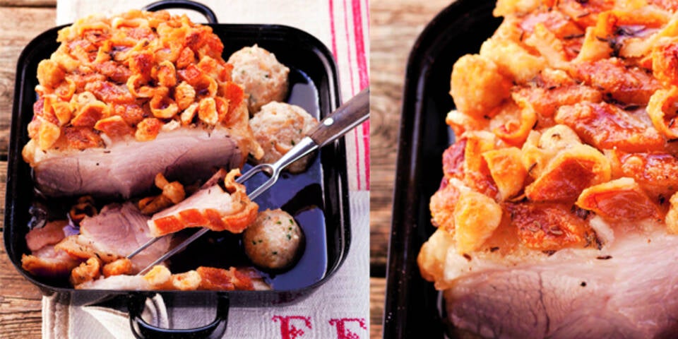 6. Falls nötig zum Ende der Bratzeit die Temperatur beim Braten auf 220 °C Oberhitze erhöhen, sodass sich eine Kruste bildet. Braten aus dem Bräter nehmen, Sauce in einen weiteren Topf passieren. Evtl. einköcheln lassen und mit Salz und Pfeffer abschmecken. Braten in Scheiben schneiden und mit Knödeln servieren.