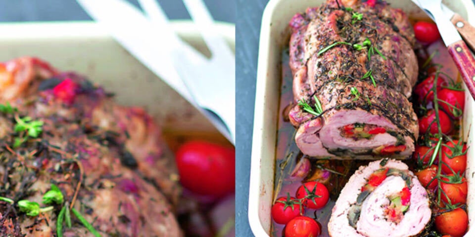 3. Die passierten Paradeiser und die Brösel unter das abgekühlte Gemüse mengen und abschmecken. Das Gemüse auf dem Fleisch verteilen und einrollen. Die Enden mit Rouladennadeln verschließen und den Braten mit Küchengarn in Form binden. Den Ofen auf 180 °C Unter- und Oberhitze vorheizen.