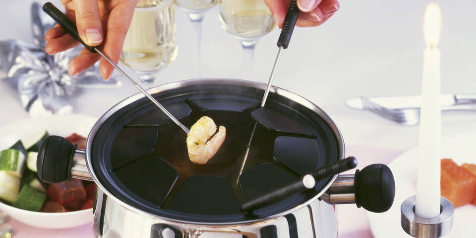 - Für das Fondue das Fleisch parieren und in mundgerechte Stücke schneiden. Die Garnelen waschen, bei Bedarf schälen und trocken tupfen. Das Öl im Fonduetopf auf dem Herd erhitzen, auf den Fondueuntersatz stellen und darauf heiß halten.