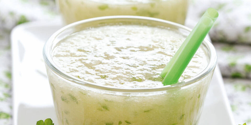 - Die Melone schälen, das Fruchtfleisch entkernen und grob würfeln. Die Petersilie abbrausen und die Blättchen abzupfen. Die Melone zusammen mit der Petersilie in einen Mixer geben und fein pürieren. Den Apfeldicksaft untermixen und mit ca. 150 ml Wasser bis zur gewünschten Konsistenz verdünnen.