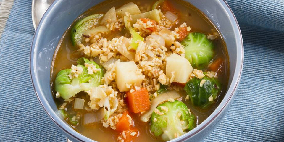 - Granulat in einem Sieb abtropfen lassen, den ablaufenden Fond dabei auffangen. Das Granulat in heißem Öl andünsten und den Kümmel untermischen. Lauch, Sellerie, Karotte und Rosenkohl dazugeben, kurz mit andünsten.