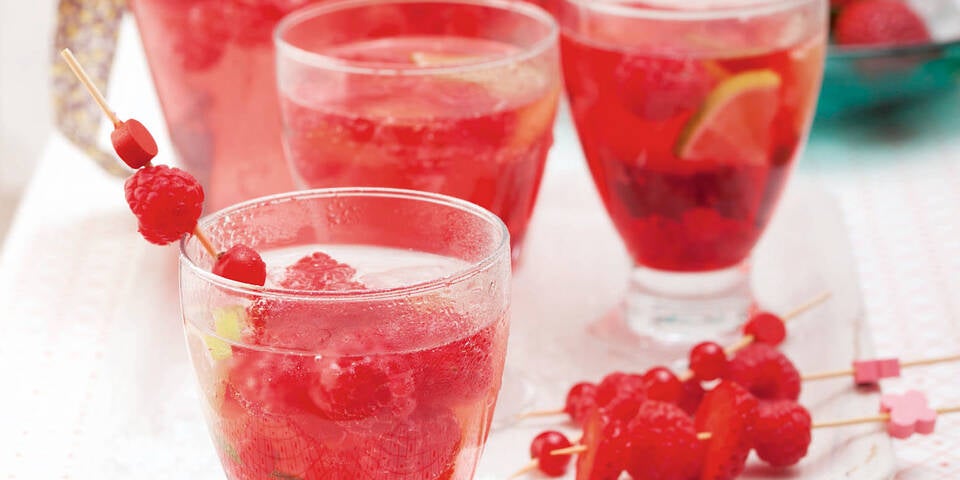 - Die Himbeeren und Erdbeeren abbrausen und trocken tupfen. Die Erdbeeren in kleine Stücke schneiden. Die Beeren hinzufügen und mit einigen Eiswürfeln servieren.