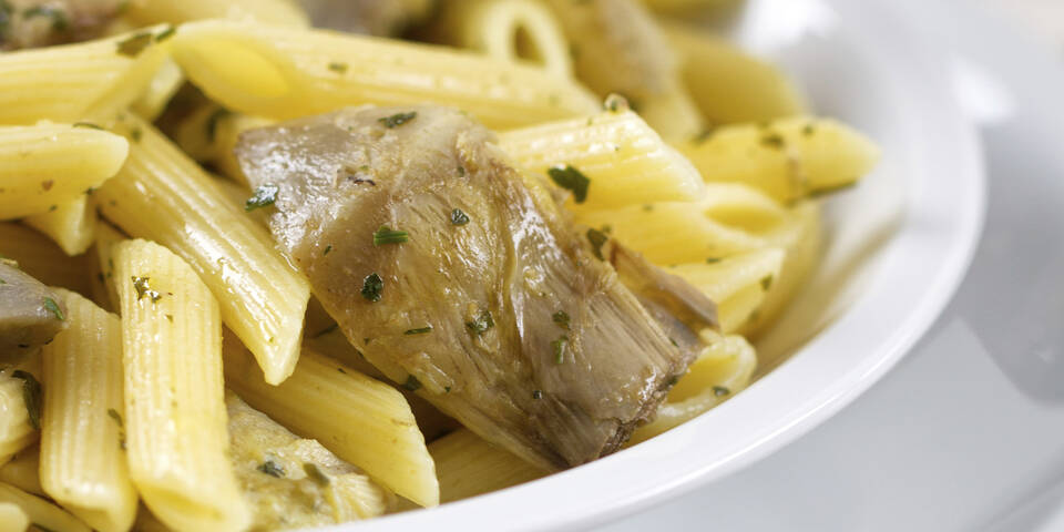 - Die Artischockenböden auslösen und mit Zitrone einreiben, damit sie sich nicht braun verfärben, in feine Scheiben schneiden. Olivenöl erhitzen, darin den Knoblauch anschwitzen. Artischocken und Petersilie beimengen, mit Rosmarin, Paprika, Salz und Pfeffer würzen und den Hühnerfond dazugeben. 15 Minuten bei kleiner Hitze köcheln lassen. Die Nudeln al dente kochen, unter die Artischocken mischen und anrichten. Auf jeden Teller einen Dotter setzen und weißen Trüffel darüber hobeln.