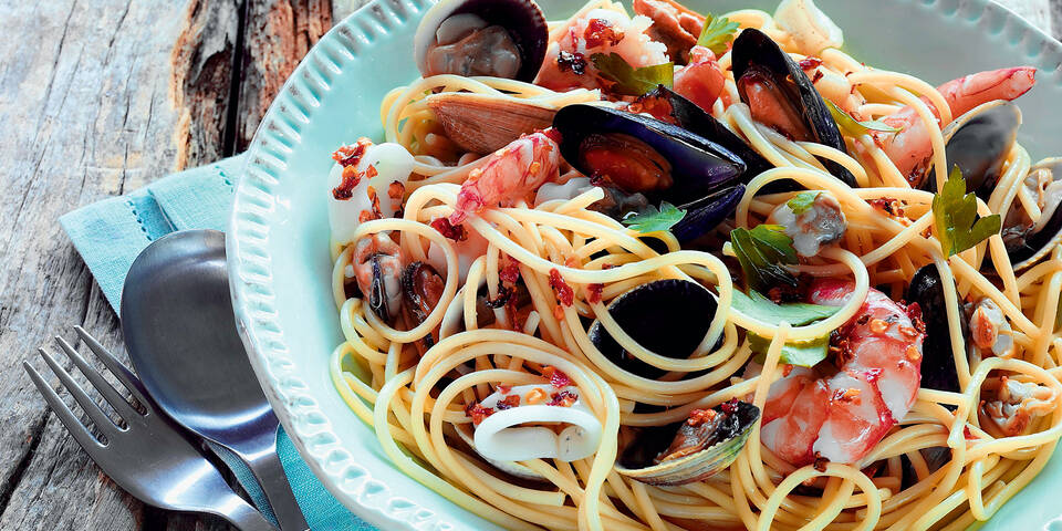 - Den Deckel abnehmen und den Sud bei starker Hitze leicht einreduzieren lassen. Die Temperatur reduzieren, die Garnelen und den Tintenfisch zugeben, mit Salz und Chili würzen und drei Minuten gar ziehen lassen. Die abgetropften Nudeln und Petersilie unterschwenken, abschmecken und auf Tellern verteilt servieren.